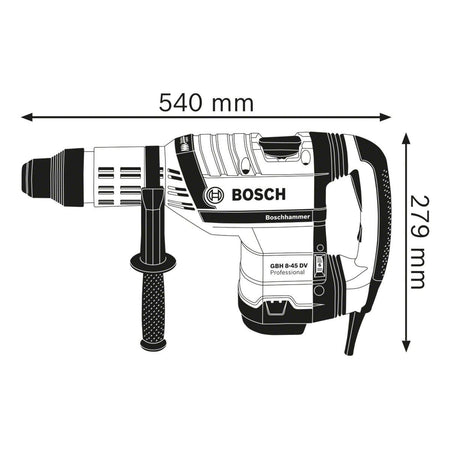 Bosch GBH 8-45 DV SDS-Max Professional Rotary Hammer features a strong motor enabling the delivery of 12.5 J of impact energy for a fast drilling progress and high material removal rate. Robust metal components provide added durability. It also includes constant speed, restart protection, rotation control clutch, speed selection, and vibration control for effortless and continuous work in time-intensive applications. Its perfect power-to-weight ratio enables it to easily perform many SDS-max tasks. This tool is intended for drilling up to 45mm in diameter and medium chiselling work in concrete and stone. It is compatible with various dust attachments.