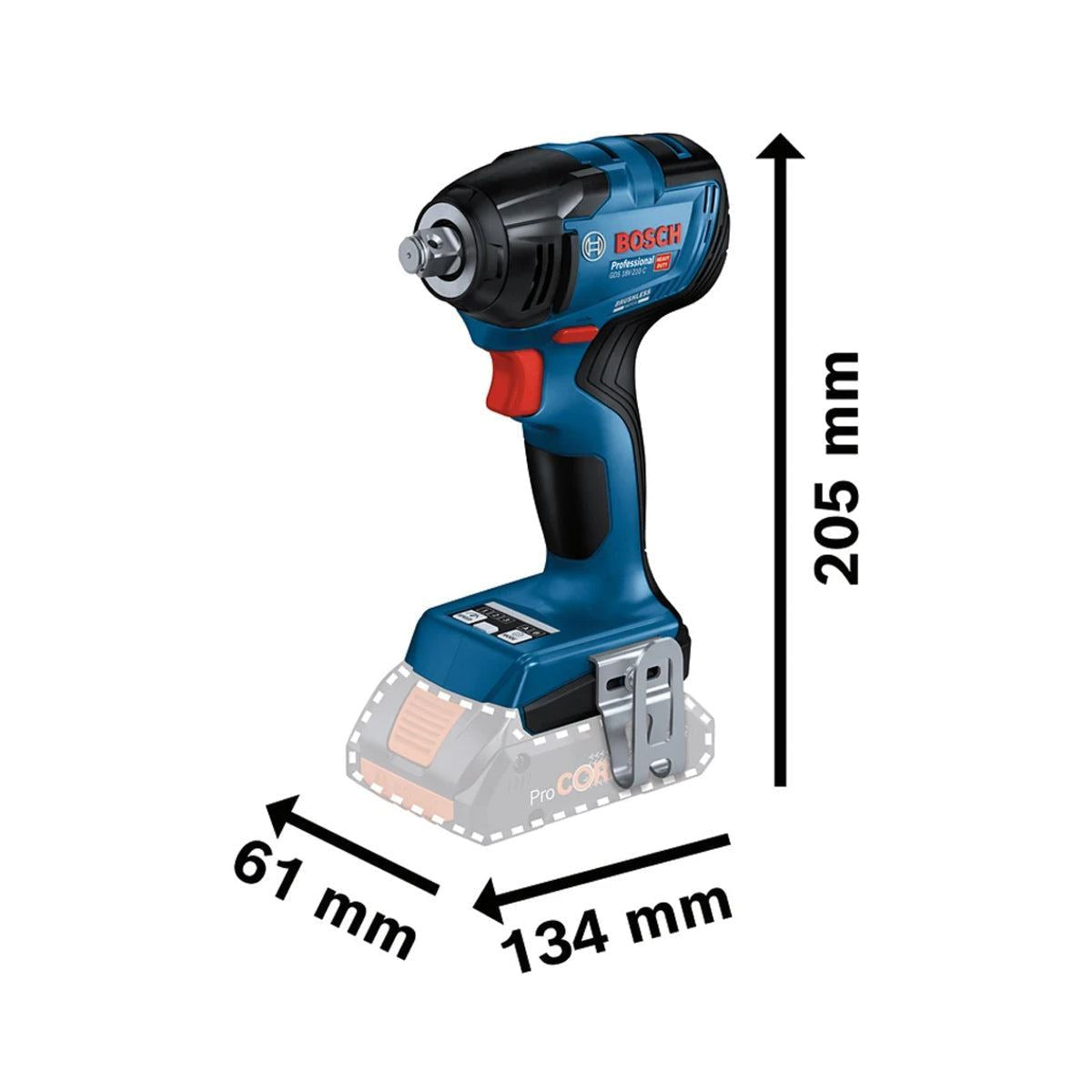Bosch GDS 18V-210 C Professional Impact Wrench with a 1/2in square bit holder. Delivers powerful performance whilst preventing damage to materials. Two default modes on the user interface, selftapping screw (A) and wood screw (B), mean more control and less broken or stripped off screwheads, worn-out threads, and damaged workpieces by slowing down or shutting off the impact driver. Each mode is customisable via the Bosch Toolbox App. Three speed/torque settings ensure impressive control and greater flexibility on the job. Comes with a status indicator, LED light, and belt clip for greater convenience.