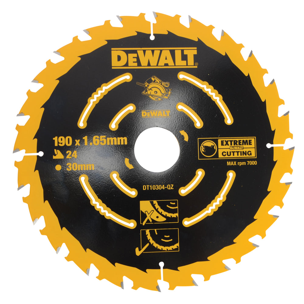 The DEWALT Cordless Extreme Framing Circular Saw Blade has a thin kerf (cutting width) to ensure that less push force is required by the user and that they cut straighter with reduced binding. The durable teeth stay sharp for a long time with reduced breakage. Suitable for ripping and cross-cutting natural timbers and cutting composite wood based sheet materials e.g. Plywood, MDF and chipboard. NOT recommended for timbers that contains nails.