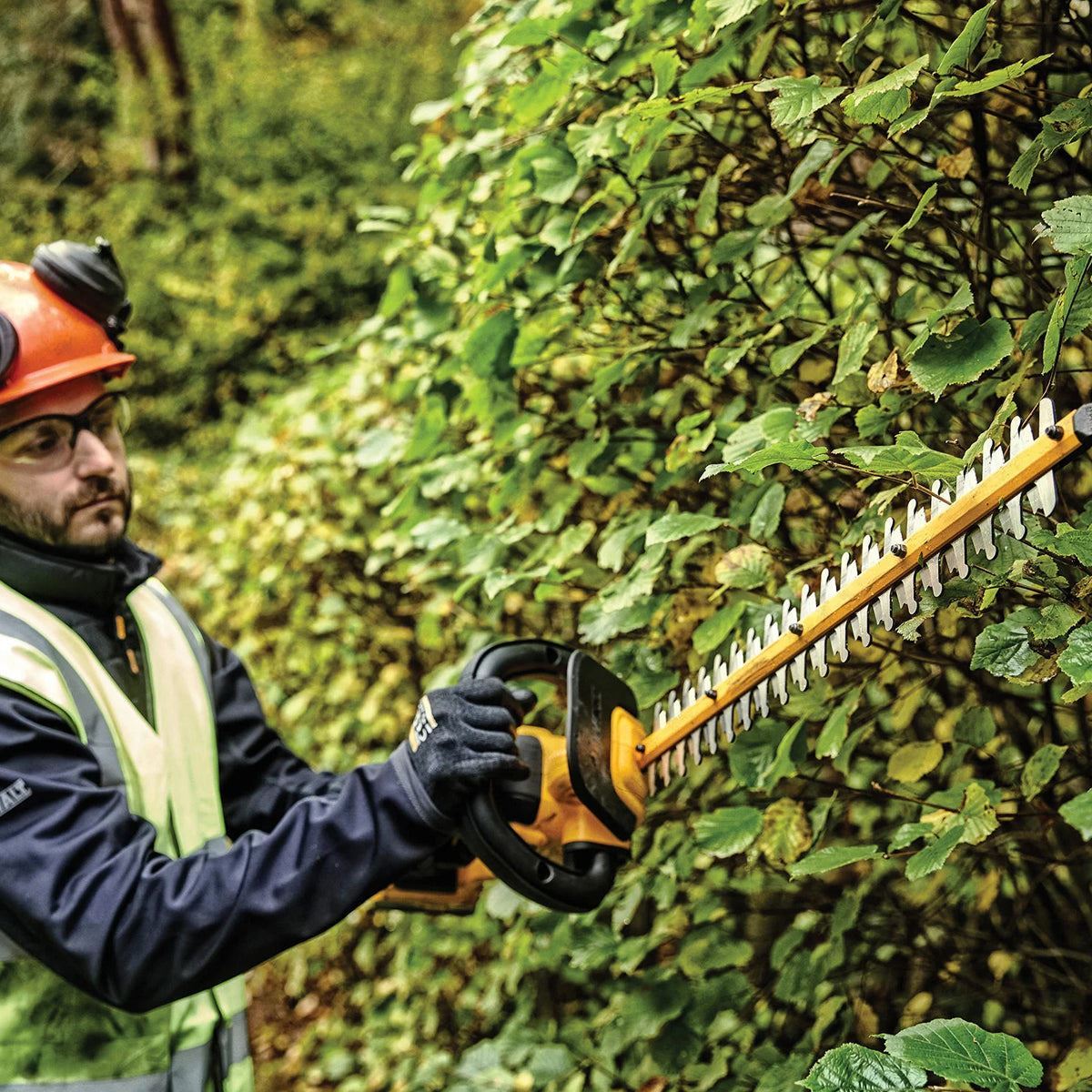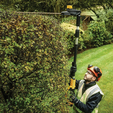 The DEWALT DCMPH566 XR Pole Hedge Trimmer has a lightweight, well balanced design for increased ergonomics and comfort. Fitted with a 7-position, 180⁰ articulating head and a hardened steel, laser cut, dual action blade. Ideal for cutting hard to reach and thicker branches.