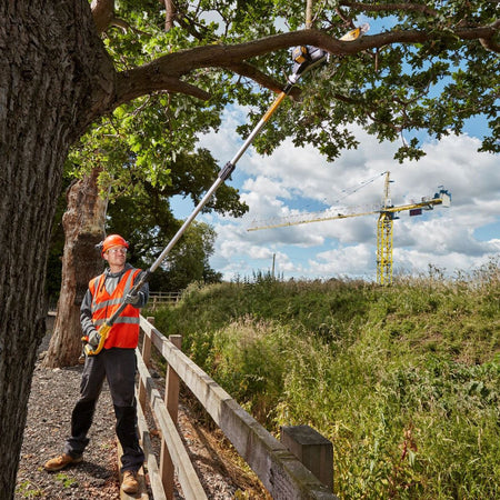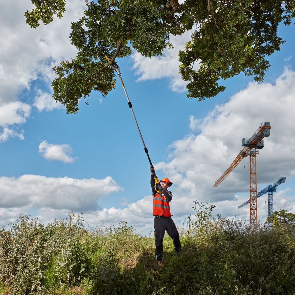Angled head allows for more controlled position when limbing High efficiency brushless motor - Delivers up to 55 cuts on a 100x100mm branches 20cm Bar with low kickback for enhanced safety Chain with auto-oiling for smooth cutting performance Dual switch reduces risk of accidental start up for enhanced safety Lightweight aluminium oval tube pole for manoeuvrability and ease of use Optimised weight and balance for comfortable and safe operation Metal bucking strips and tree hook - Durable cutting grip and easily remove pruned branches 2m pole length, extendable to 2m offering a total reach of 4.5m for quick and easy reach to higher work areas