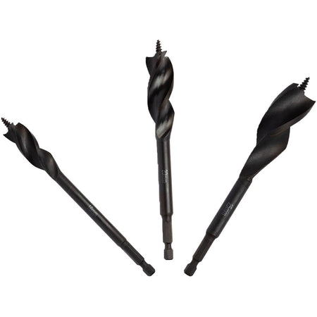Three cutting edges allow for up to 6x faster cutting* combined with tri-flute design for optimum chip removal. Three cutting spurs for cleaner, faster holes and extended drilling life. Tri-flute tapered design for faster removal of wood chips and less binding. Full screw tip allows bit to self-feed for ease of use and pull through. Quick-change shank fits standard Quick-Change extensions and 1/4" / 6mm hex bit adapters, preventing spinning.