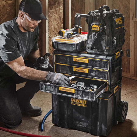Dewalt DWST08330-1 TOUGHSYSTEM 2.0 Drawer Unit is a storage solution designed for use on tough jobsites. It features three shallow drawers that are made from impact-resistant ABS plastic and can hold up to 19.8 kg of weight each. The drawers open and close smoothly on ball-bearing metal slides, and the unit has a carrying handle for easy portability. It is also IP65 rated for dust and water resistance.