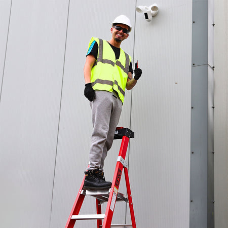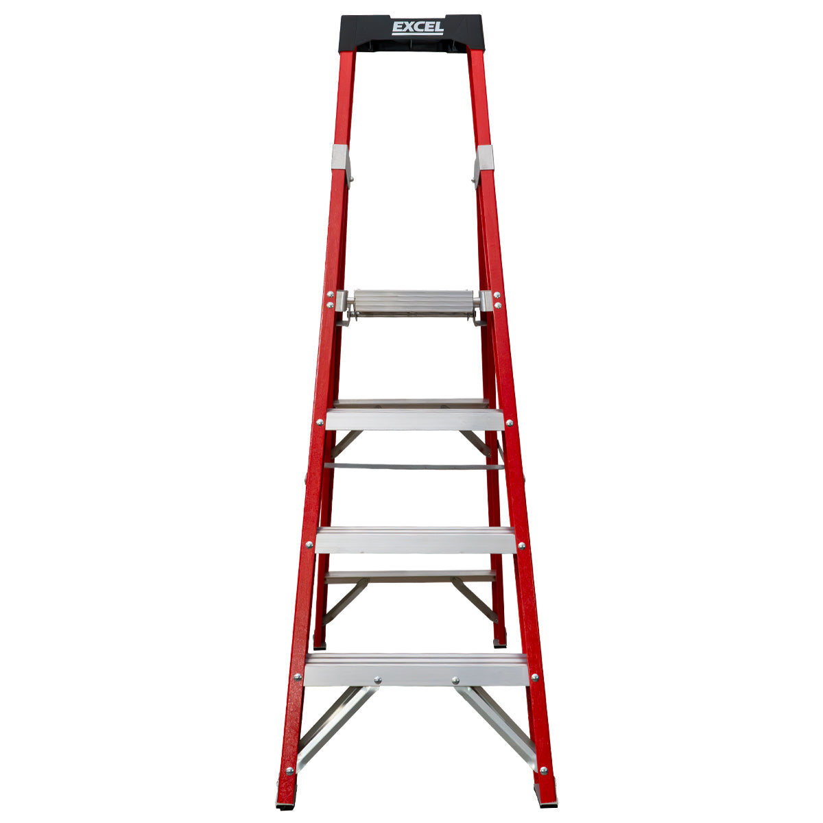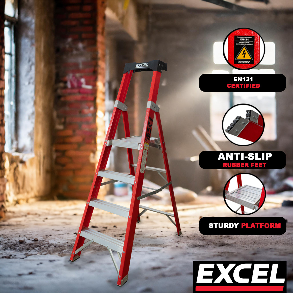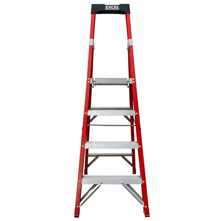 Excel Fibreglass Platform Step Ladder is made of fiberglass and has 4 treads. It is 1.57m tall and is EN131-certified. It is designed for electricians, home and garden work with maximum load capacity of 150kg. It is lightweight, durable, and non-conductive which means that they can be safely used around electricity. Other features include slip-resistant steps for comfortable standing, Holster top to keep tools organised, Sturdy platform provides a secure and comfortable work area.