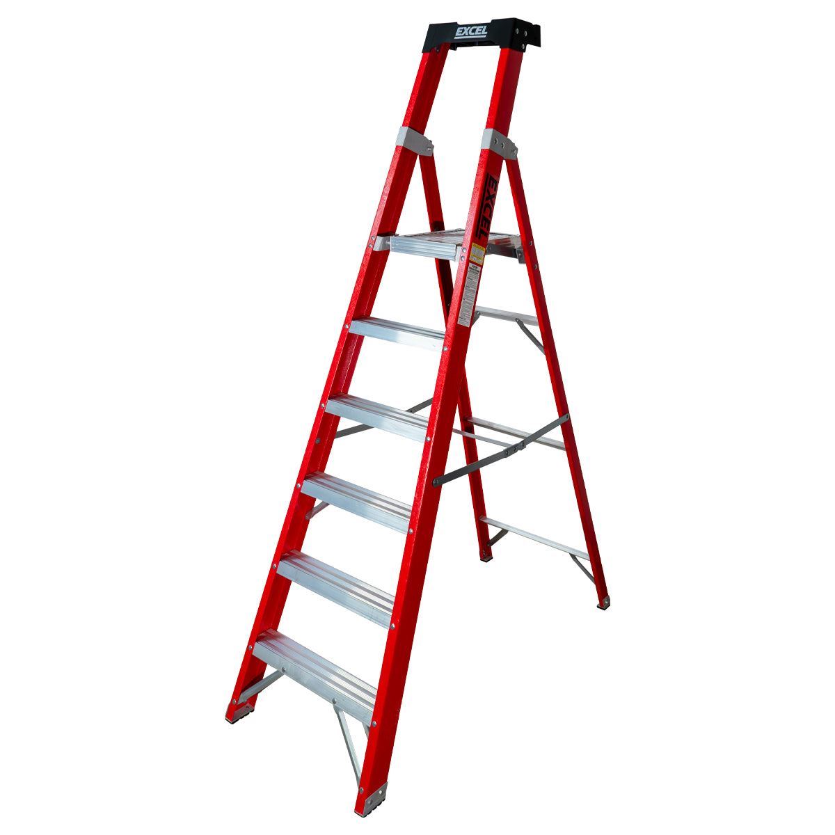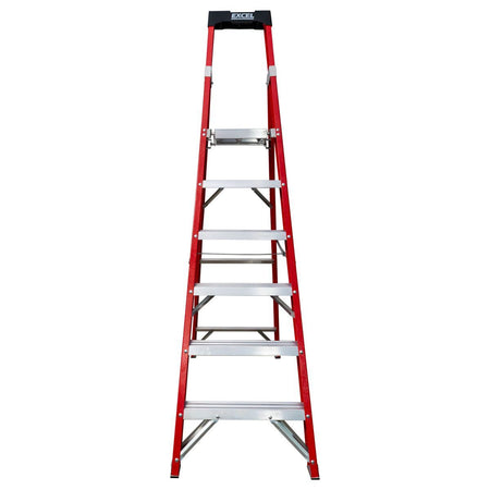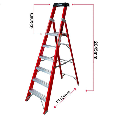 Excel Fibreglass Platform Step Ladder is made of fiberglass and has 6 treads. It is 2.04m tall and is EN131-certified. It is designed for electricians, home and garden work with maximum load capacity of 150kg. It is lightweight, durable, and non-conductive which means that they can be safely used around electricity. Other features include slip-resistant steps for comfortable standing, Holster top to keep tools organised, Sturdy platform provides a secure and comfortable work area.