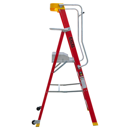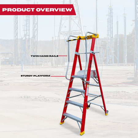 Excel Fiberglass Podium Step Ladder with 4 tread and a platform is a versatile tool that can be used for a variety of tasks around the house or workplace with maximum load capacity of 150kg. It is lightweight and easy to move, but also stable and secure. The fiberglass construction makes it non-conductive, so it can be used safely around electricity. The ladder includes twin handrails for safety when climbing the ladder and slip-resistant steps for comfortable standing.