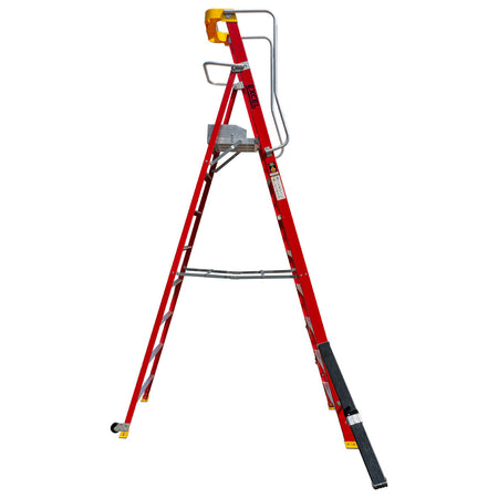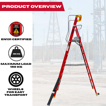 Twin handrails for added safety during use Maximum Load Capacity of 150kg Non-conductive fibreglass ideal for working around electricity Sturdy platform for added strength Suitable for both indoor and outdoor use Extra wide tread with slip-resistant surface and additional crossframe brackets to increase rigidity & stability Stabilisers gives increased safety & stability when working at height Approved to the latest EN131-7 standard For Professional Use