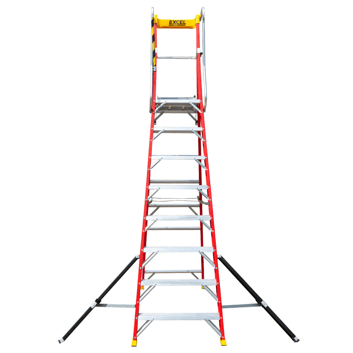 Brand: Excel Barcode: 5056533499991 Material: Fibreglass Tread Count: 8 Maximum Load: 150kg Total height:3.18m Total height: 3.18m Platform Height: 2.23m Platform Dimension: 406 x 475mm Dimension (H x W x L): 3180 x 844 x 1867 mm Space between Treads: 300mm Insulation Tested: Non-Conductive of Electricity Certifications: EN131-7 Professional and Non-Professional Use Weight: 22.5kg