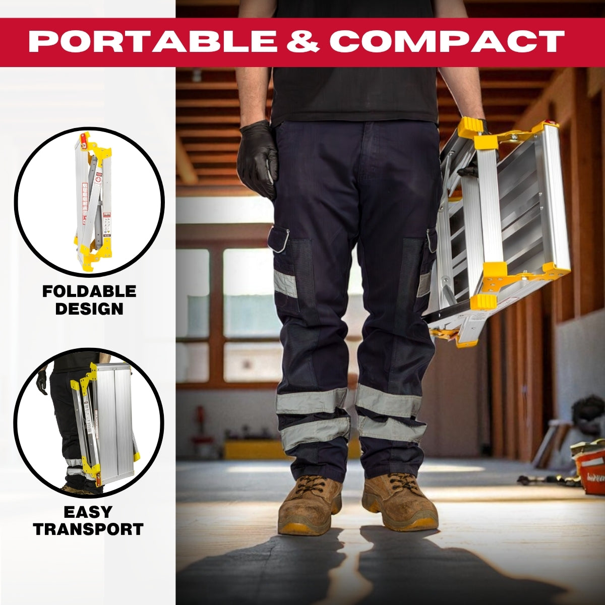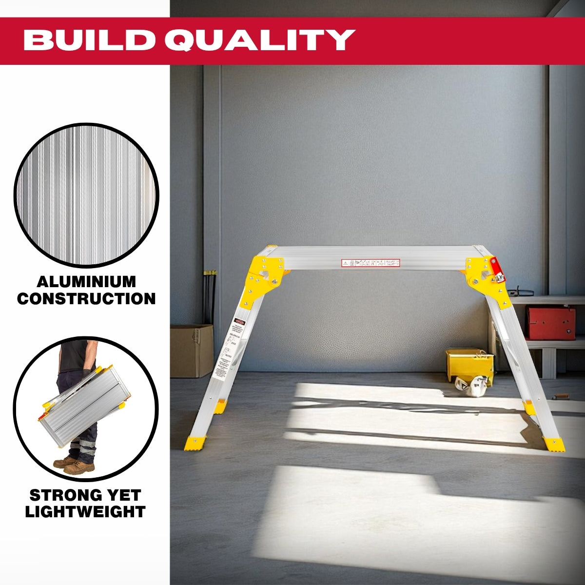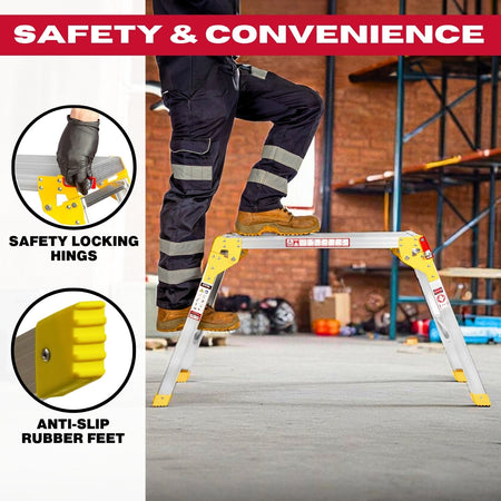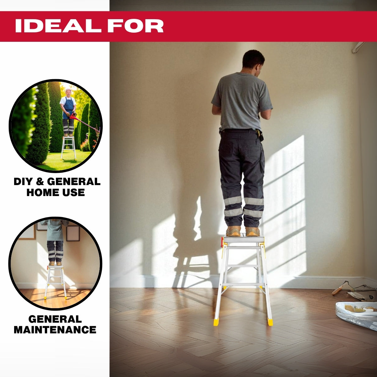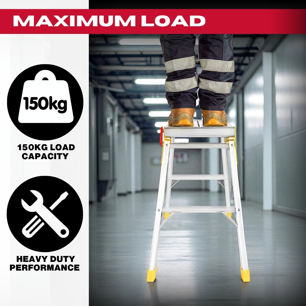 Maximum weight capacity of 150kg Made from high-quality aluminium Foldable design for easy transport and storage Slip-resistant platform Lightweight and easy to transport Perfect for all odd job Versatile and multi-functional tool Can be used as a step ladder or a work bench Simple and safe to use with locking hinges for added safety whilst working