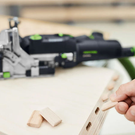 The Festool DF 500 RQ-Plus is a highly precise and versatile corded DOMINO joining machine designed for professional woodworkers. Its unique pendulum milling system ensures accurate and effortless dowel placement, while built-in stop pins allow for quick, repeatable positioning. The DOMINO dowels create exceptionally stable, twist-proof joints and are available in various sizes and wood types for both indoor and outdoor use. It supports applications from frame and panel joints to mitre and round profile connections. Compatible accessories and flexible core connectors make it ideal for creating furniture that’s strong yet easily disassembled.