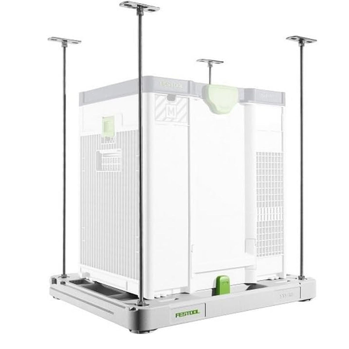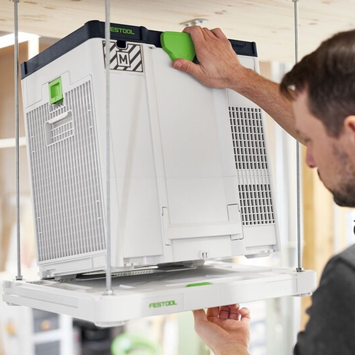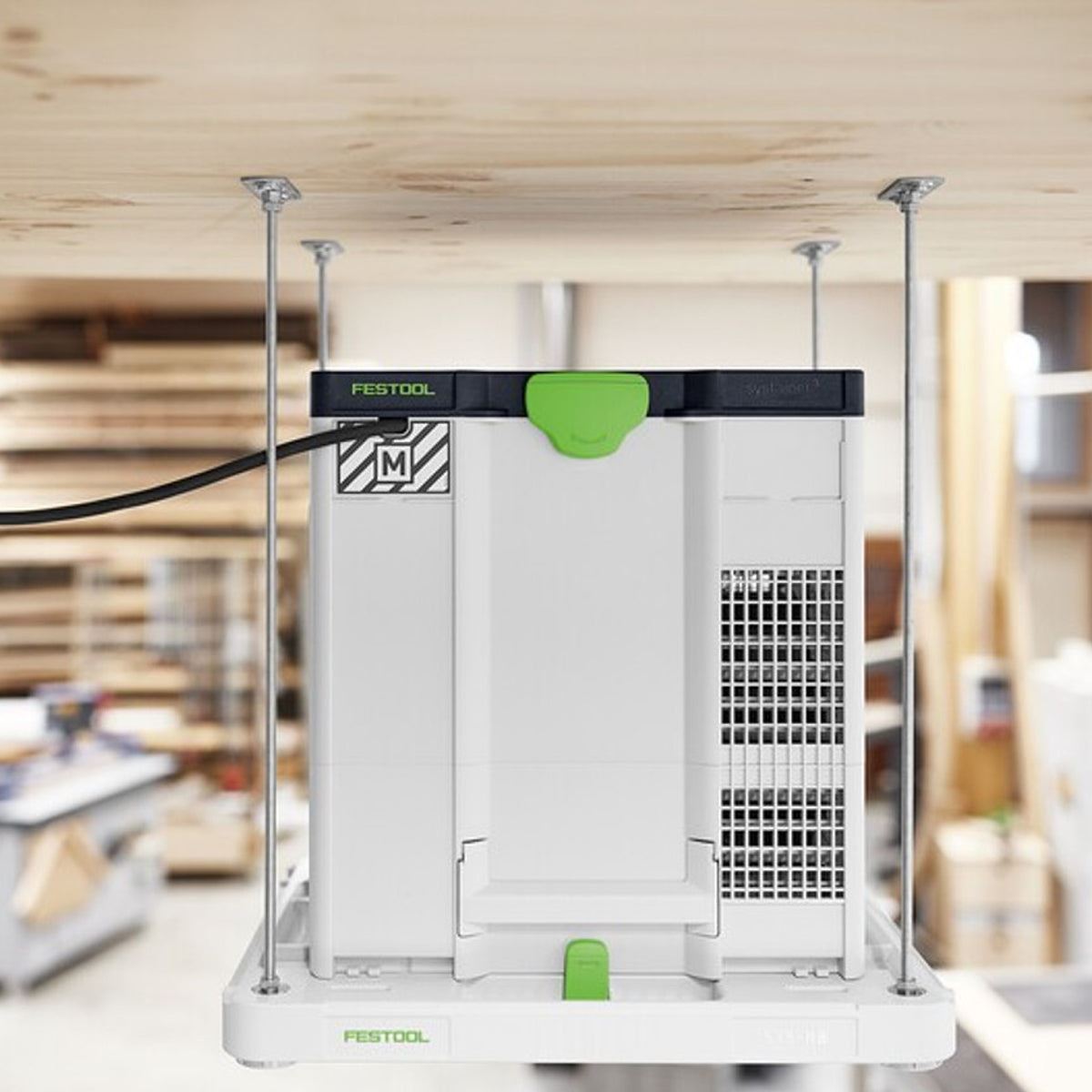 The Festool DH‑SYS‑AIR ceiling bracket 578357 weighs about 6.17 lb (2.8 kg) and securely suspends your SYS‑AIR air purifier overhead using a Systainer® base and threaded rods. Its T‑LOC quick-release system lets you remove and remount the unit effortlessly without tools, while maintaining full access for filter changes . Compatible with various ceiling materials like wood or concrete, it's ideal for saving floor space and improving workshop air quality.