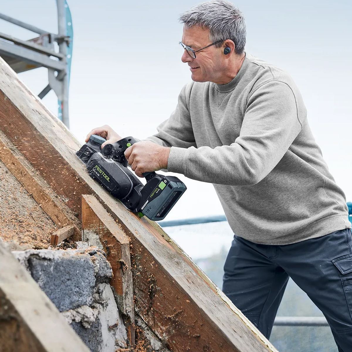 The Festool HLC 82 EB-Basic is a high-performance cordless planer designed for powerful, precise, and quiet operation. Its brushless EC-TEC motor delivers consistent power, even at a maximum chip depth of 2.5 mm. With a 25 mm rebate depth, dual extraction channels, and a spiral blade, it ensures smooth surfaces and efficient chip removal. The ergonomic design, integrated V-grooves for chamfering, and adjustable chip depth offer flexibility and control. It’s compatible with all Festool 18V battery packs (except Ergopack) and includes a quick-acting brake for added safety.