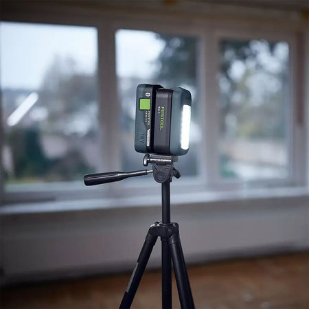 Ready for use: Small, light and compact and simply always at hand. Fits into the Systainer battery compartment or toolbox. Bright: At 1200 lumens, uniform illumination of the work area and reduced shadowing. Flexible: Brightness adjustable to three levels (300/600/1200 lumens). Replicates daylight: Natural light colour (5000 K) for an optimum working light. Versatile: Lamp head can be swivelled to any point between 0 and 180°, and can also be hung on a hook or positioned on a tripod. Compact: Particularly suitable for confined spaces and hard-to-reach work areas. Long-lasting: Robust and shock-proof, dust and splash-proof housing. Long-lasting: Lights up for 90 minutes per Ah, i.e. six hours with a 4.0 Ah battery pack at the brightest level. Compatible: With all Festool battery packs (except Ergo pack). with 24 LEDs, three brightness levels and up to 1200 lumens for the optimum illumination of the work area within 1–2 metres