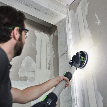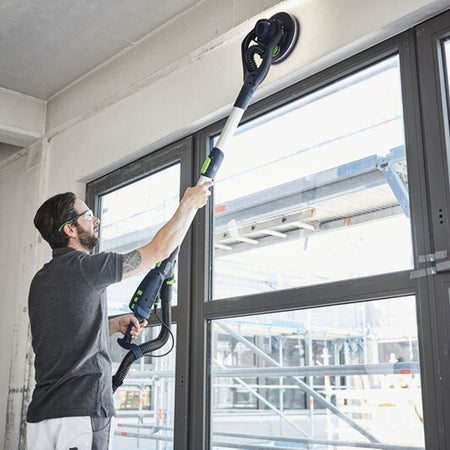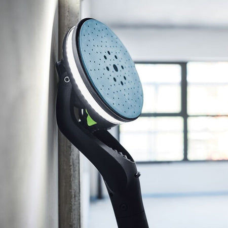 The Festool LHS 2 225 EQI-Plus is a top-tier long-reach drywall sander designed for effortless wall and ceiling finishing. It features an innovative LED light ring around the sanding head, which highlights surface imperfections as you work, ensuring flawless results. Powered by a durable brushless EC motor, it delivers consistent performance with minimal maintenance. Its random orbit sanding action helps achieve smooth, streak-free surfaces. The adjustable suction function partially supports the sander's weight, greatly reducing strain on the user. All components come neatly organized in a robust Systainer, making it easy to transport and store.