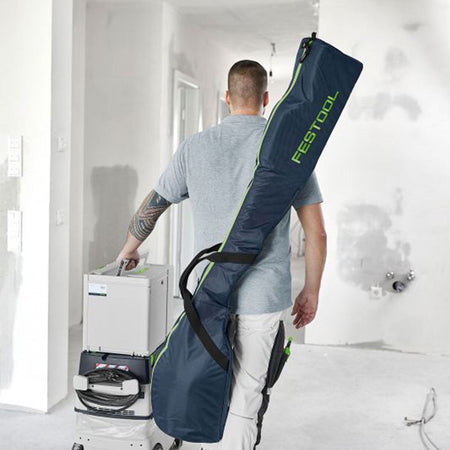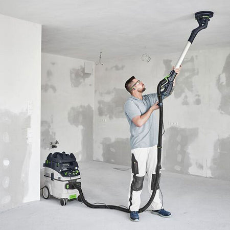 The Festool PLANEX LHS 2-M 225 EQ Long-Reach Sander is designed for top-tier surface finishing with its eccentric sanding motion that delivers a smooth, groove-free result. It features adjustable suction power to reduce arm and back strain by supporting its own weight during use. At 1.4 meters, it's perfectly suited for standard room heights and includes a T-shaped handle for extended reach. Built to last with durable components and a brushless EC-TEC motor, it also ensures virtually dust-free sanding when paired with the CT 36 E AC PLANEX extractor (sold separately). The included carrying bag makes transport safe and convenient.
