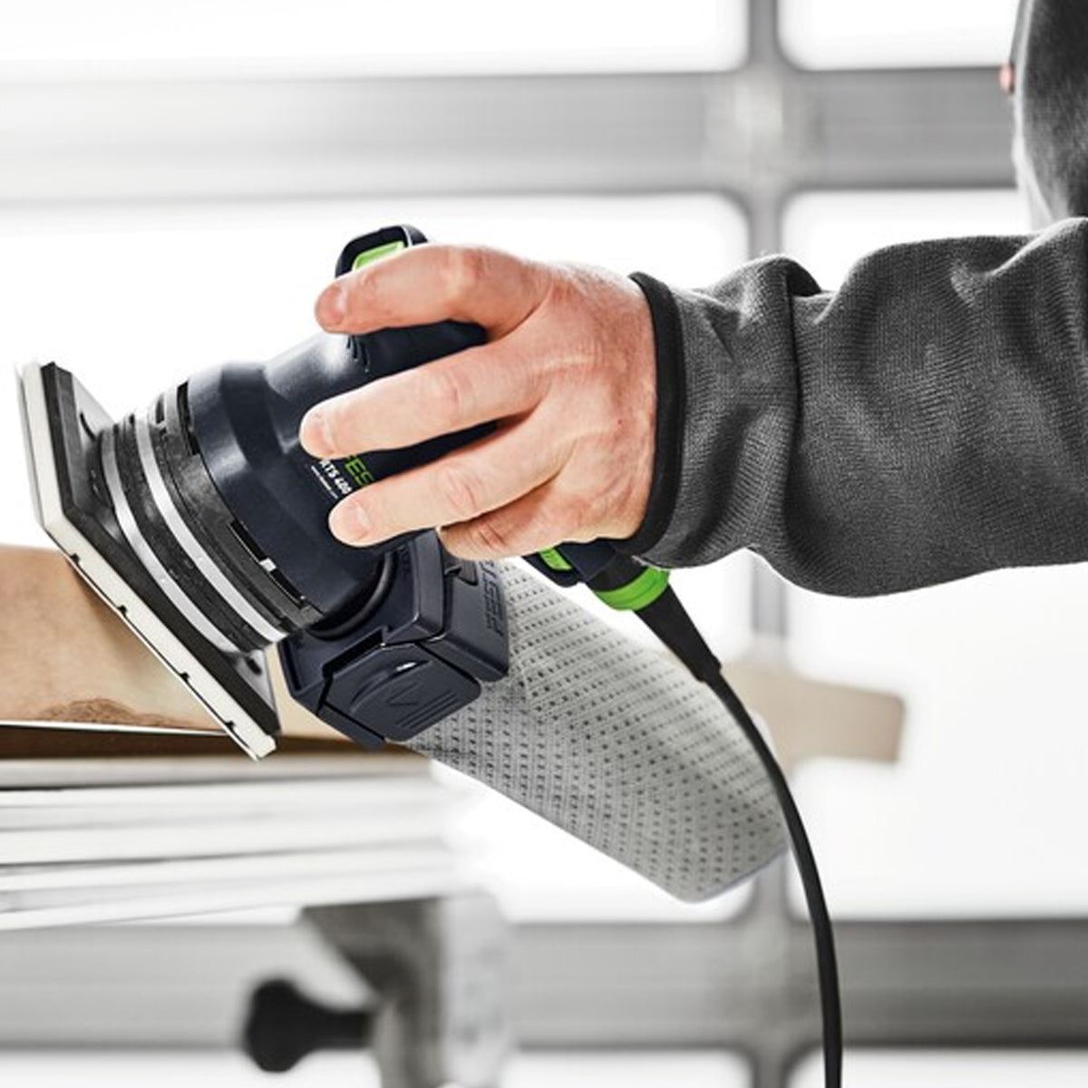 The Festool RTS 400 REQ-Plus 230V GB Orbital Sander 576053 is a compact, lightweight sander designed for effortless one-handed operation. Ideal for vertical and overhead sanding, it features a powerful 250W MMC motor that delivers consistent performance. The sander includes Festool's CLEANTEC dust extraction system for cleaner work environments and better visibility. With its ergonomic design and low vibration, it offers excellent control and comfort during prolonged use. It comes neatly packed in a durable Systainer³ case for organized storage and transport.