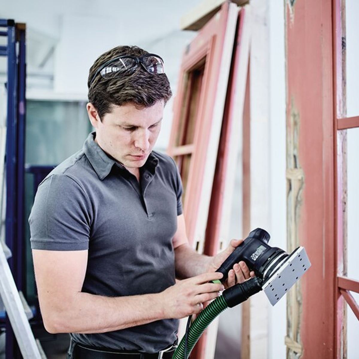 A healthy working environment and less rework: In combination with the mobile dust extractor or the long-life dust collection bag and attachable PROTECTOR for smooth sanding along window surfaces, frames and panelling