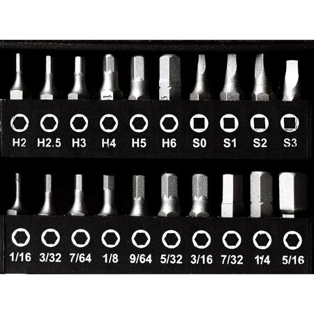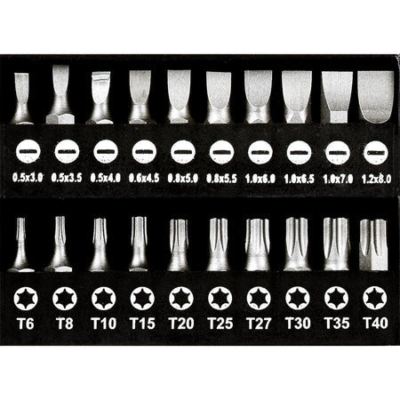 Precision drivers (8 pcs): T6, T7, T8, T10, PH00, PH0, and fine Slotted sizes for electronics/eyewear.