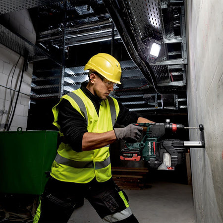 The Metabo KH 18 LTX BL 24 Q SDS+ Combination Hammer Drill is a lightweight, compact cordless tool designed for maximum performance and durability, thanks to its brushless technology. It offers three functions: hammer drilling, drilling, and chiselling, making it versatile for different applications. The Metabo VibraTech (MVT) system reduces vibrations to protect the user, while the Metabo Quick feature allows for fast switching between the SDS Plus hammer chuck and a keyless chuck. It also includes Vario-Tacho-Constamatic (VTC) electronics for maintaining constant speed under load and double safety features with mechanical decoupling and sensor-controlled shutdown in case of bit jams. An LED work light enhances visibility during use.