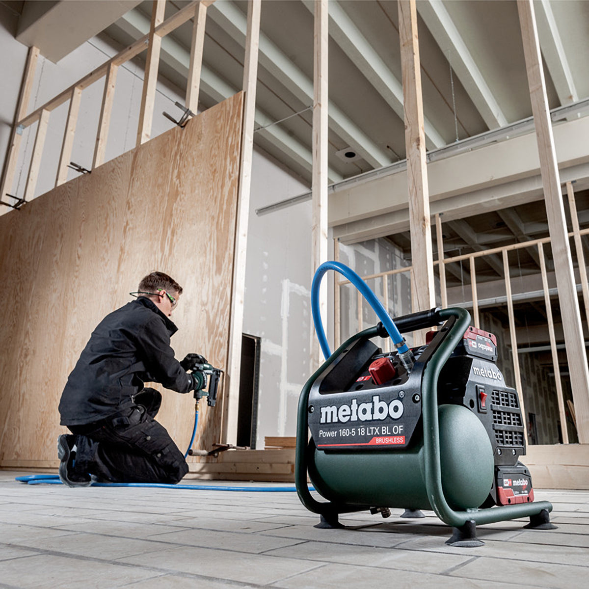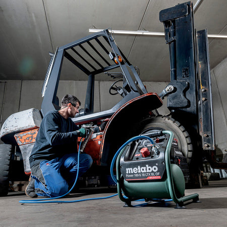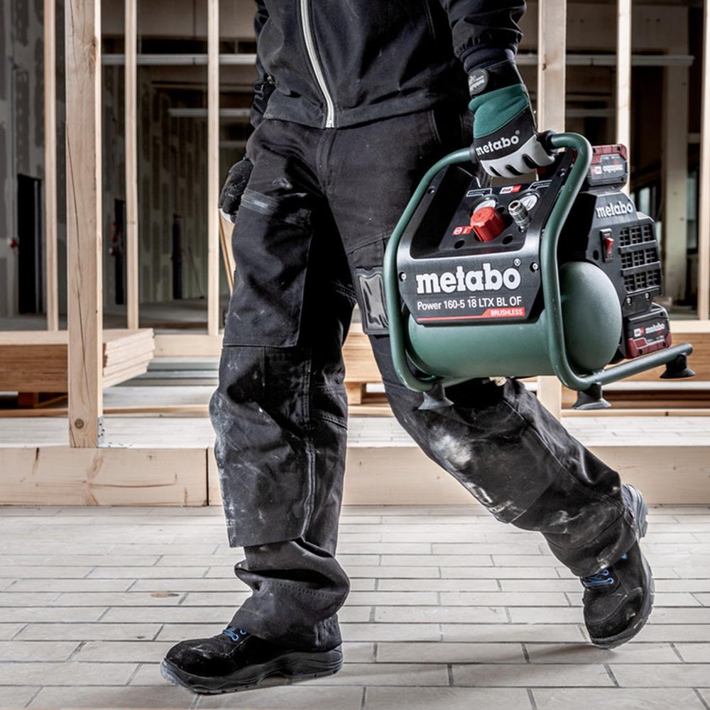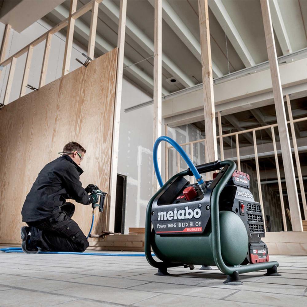 The Metabo Power 160-5 18 LTX BL OF is a lightweight and powerful 18V cordless compressor, ideal for interior work and construction sites. Its brushless motor ensures high efficiency and durability, while the oil-free piston design allows for easy transport and low maintenance. The instrument panel features clear manometers for monitoring tank and working pressure. A pressure regulator enables precise pressure adjustment for different applications. Additionally, the protective tubular frame enhances durability, and a second battery slot ensures uninterrupted work.