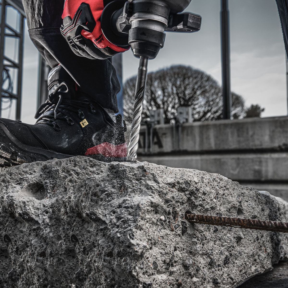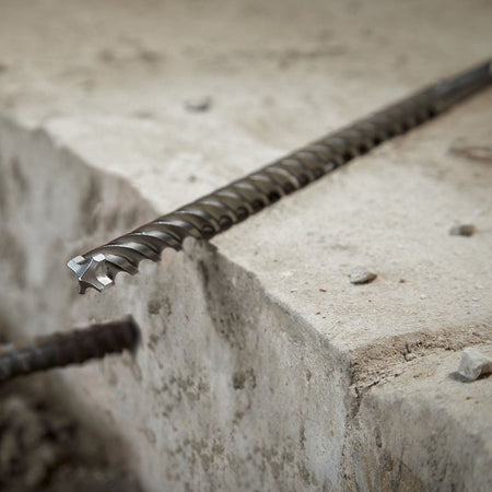 The Milwaukee MX4™ SDS-Plus drill bit is engineered for the toughest applications, featuring innovative fully welded solid carbide tip technology (up to ⌀ 20 mm) for maximum durability in rebar and unmatched drilling speed in concrete.