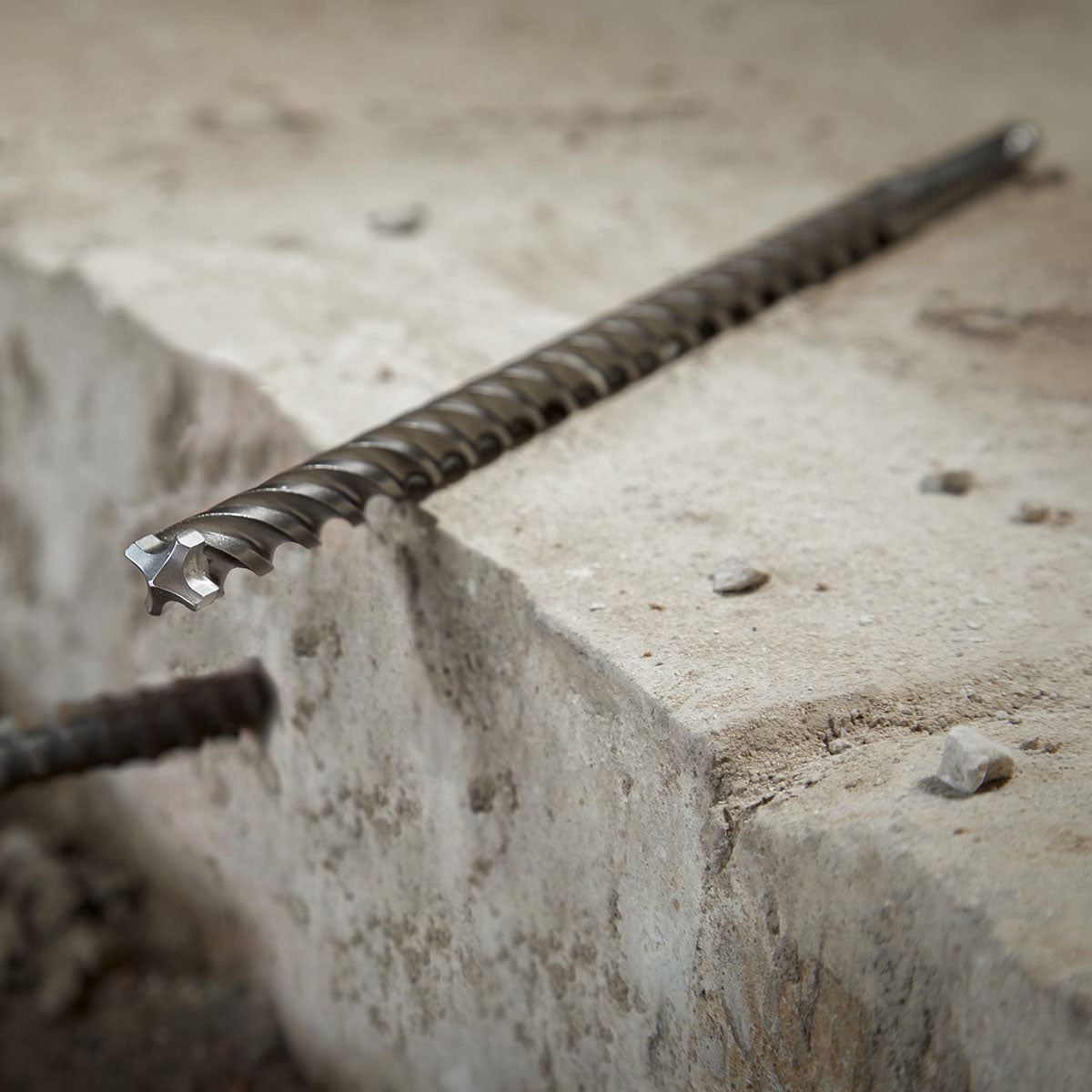 4-Cutter solid carbide tip: Enhanced geometry with a sharp centering tip, rebar guards, and new dust grooves delivers clean starts, precise holes, and maximum life when drilling through rebar - even under extreme jobsite conditions.