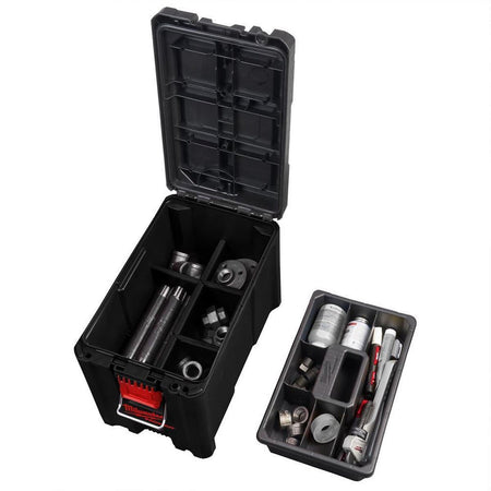 The Milwaukee 4932471723 PACKOUT Compact Tool Box has a healthy 34kg weight capacity, with enough storage to hold a variety of power tools including circular saws and drill drivers. The box is composed of impact resistant polymers, suitably protecting it from wear and tear on the jobsite. The box is also IP 65 rated, meaning it effectively protects against rain and debris. The incorporated Quick-Adjust Dividers enable users to organise contents such as larger tools alongside smaller accessories and fittings.