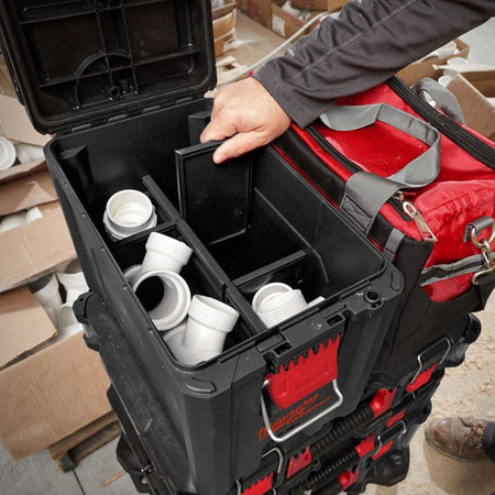 Quick-Adjust Dividers allow users to store and organize larger equipment and accessories, such as fittings, connectors or caulk. Enough storage capacity to fit power tools like circular saws, grinders, drill drivers. 34 kg weight capacity. Constructed with impact resistant polymers for jobsite durability. IP 65 rated weather seal to keep out rain and jobsite debris. Part of the PACKOUT™ modular storage system.