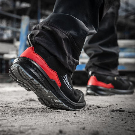 The Milwaukee Flextred S3S Safety Trainers are lightweight and flexible, ideal for tradesmen needing reliable foot protection. Built with ENERGY FOAM heel cushioning, they deliver excellent comfort and energy return throughout the day. The STEP-RELEASE™ heel allows quick and easy removal, while the ROLLCAGE™ stabilizer ensures stability on uneven terrain. A water-repellent nubuck leather upper shields against dirt and moisture, and the scuff cap boosts durability. These trainers are metal-free, ESD certified, and meet EN ISO 20345:2022 S3S safety standards.
