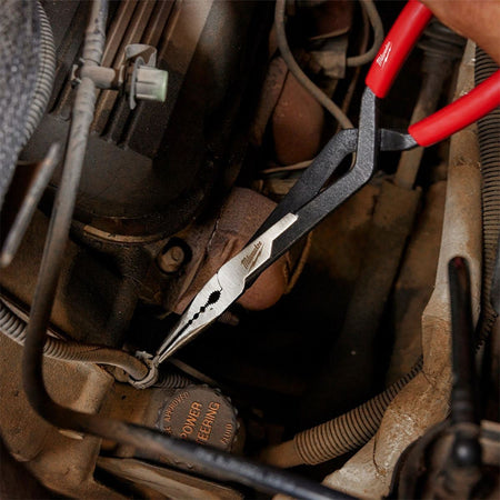 Milwaukee 4932492499 Long Reach Pliers Set is a 2-piece set that includes a straight long reach plier and a 45-degree long reach plier. The pliers have deep-reach cross handles for increased reach in tight spaces, multi-function gripping zones for grabbing a wide variety of materials, a single-joint grip force for more control, and textured noses for gripping and twisting. Popular among professional electricians, plumbers, HVAC technicians, and other tradespeople who need to reach into tight spaces to grip and manipulate wires, cables, and other small objects.