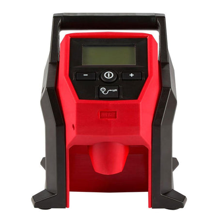 The Milwaukee M12BI-0 M12 Sub Compact Inflator is a lightweight, efficient tool designed for fast inflation of car, truck, and equipment tires. Its high-efficiency motor and pump, combined with an anti-vibration stand, ensure stable operation. The auto shut-off feature allows for precise inflation to pre-set pressures, while the illuminated LCD display shows pressure and remaining battery life. It includes convenient storage for the 66 cm hose and attachments, featuring an all-brass Schrader chuck. Powered by the REDLITHIUM battery system (sold separately), it delivers exceptional performance and is compatible with all MILWAUKEE M12 batteries.