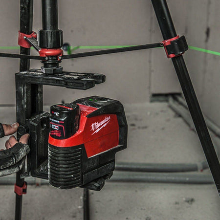 The M12 green cross-line laser with plumb points provides all-in-one functionality with horizontal levelling, vertical alignment, and plumb point transfer from floor to ceiling