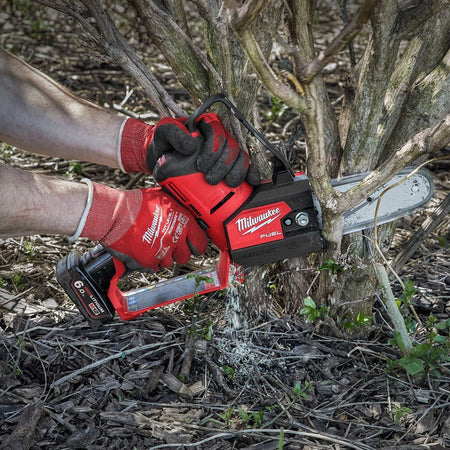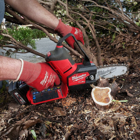 M12 FUEL HATCHET pruning saw delivers outstanding control & access, has the power to cut 75 mm hardwoods, and delivers up to 120 cuts per charge on an M12 B4 battery pack