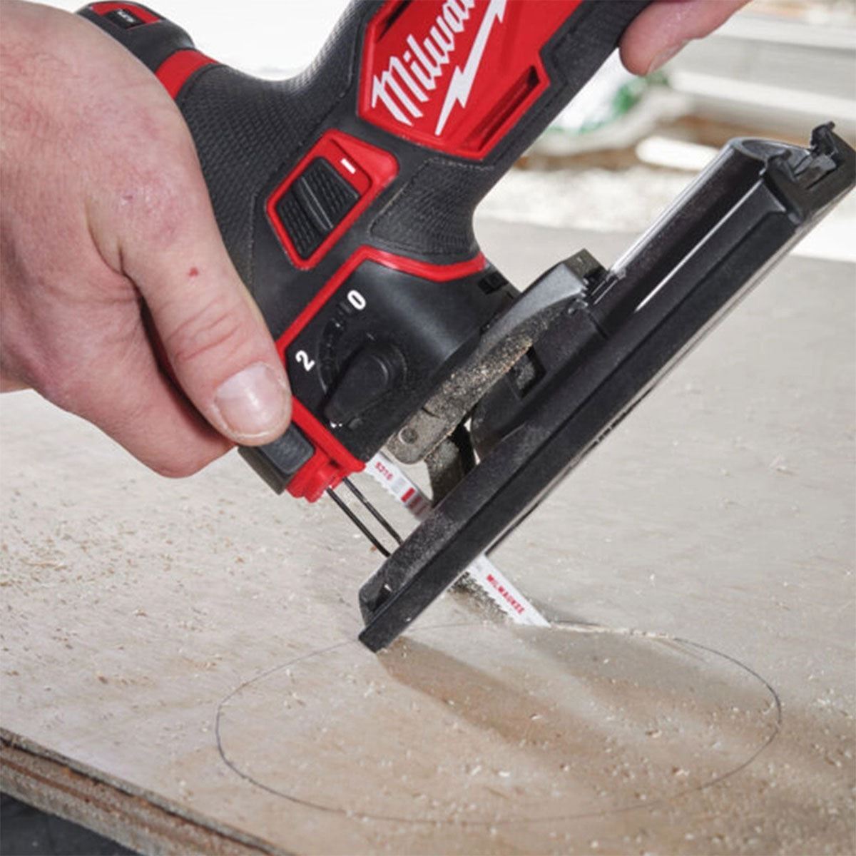 The Milwaukee M12FJS-422X Jigsaw is a high-performance tool designed for precision and efficiency. Its brushless motor provides extended run time and increased power, while the FIXTEC blade clamp enables quick and easy blade changes. Equipped with a dust blower and detachable soft shoe, it ensures clean cuts and protects delicate materials. The jigsaw offers 6-speed settings with an auto-controlled start mode for smooth, accurate cuts and reduced chipping. Featuring REDLINK PLUS intelligence and an integrated LED light, it delivers outstanding durability and workspace visibility. Compatible with all M12 batteries, it ensures versatile operation.