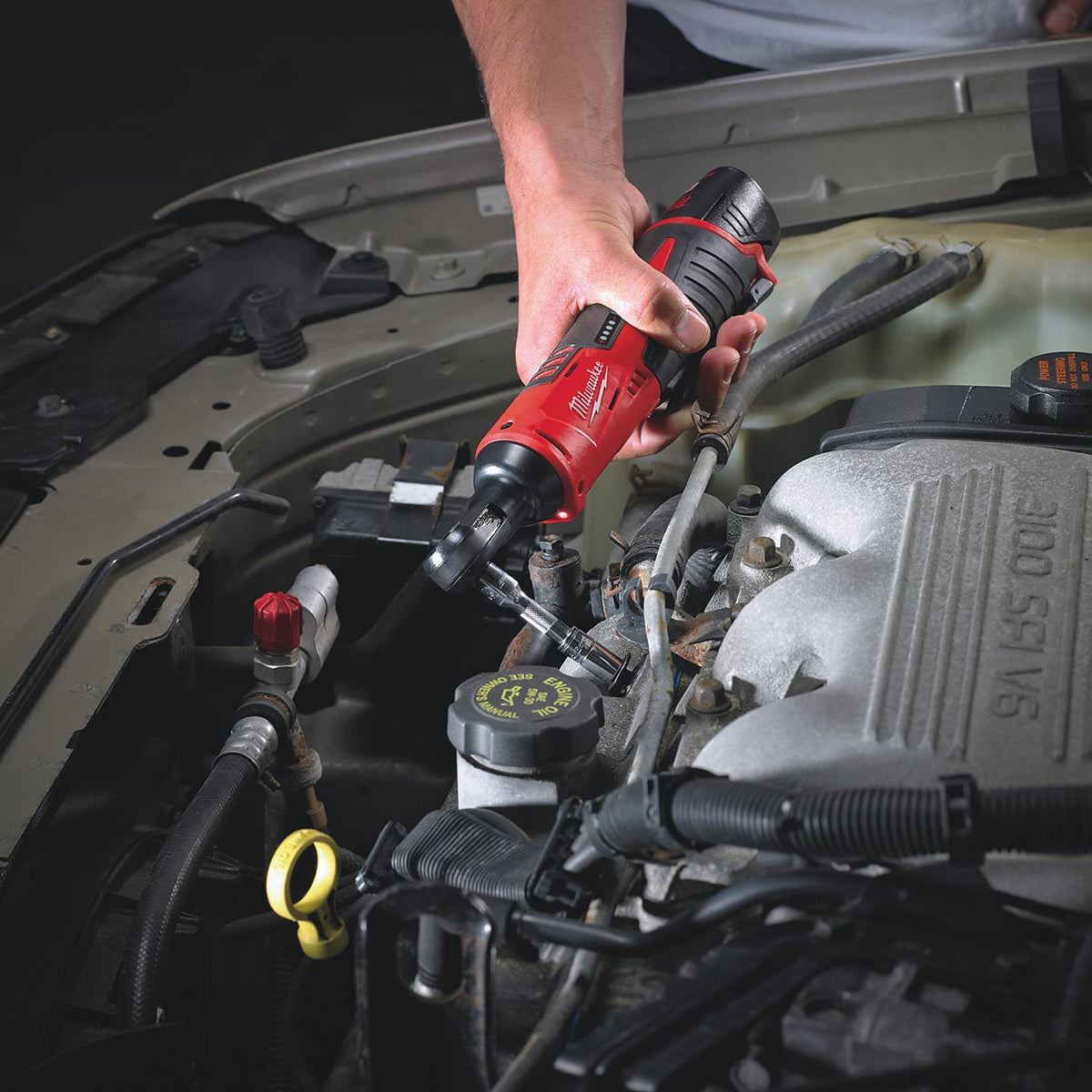 The Milwaukee M12IR-201B 12V 3/8" Sub Compact Ratchet offers cordless convenience with pneumatic-like performance, delivering up to 47 Nm of torque and 250 rpm. Its compact design makes it perfect for tight spaces and small engine bays. Equipped with REDLINK™ overload protection and a reinforced housing, it ensures long-lasting durability. The variable speed paddle switch allows precise control, while the onboard LED light and fuel gauge add convenience. Powered by the REDLITHIUM™ battery system, it provides extended runtime and works with all Milwaukee M12™ batteries.