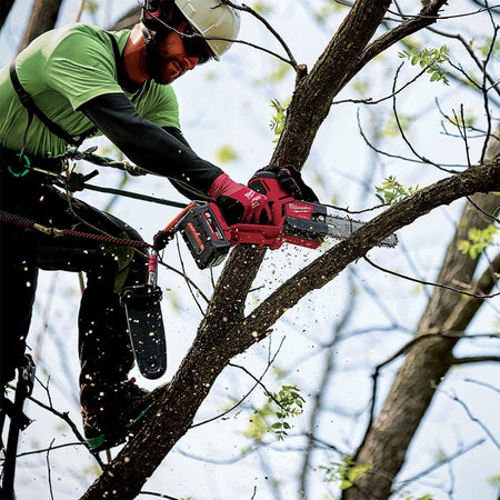 POWERSTATE Brushless Motor Pruning saw delivers outstanding power and torque to cut hardwood without bogging down Designed to meet the ergonomic, performance, and durability needs of landscape maintenance professionals Compact design for increased control and maneuverability in tight access areas Up to 180 cuts in 10 x 10 cm cedar on a full M18 HIGH OUTPUT 5.5 Ah battery charge for outstanding productivity Easy access chain tensioner ensures quick adjustment to chain tension Variable speed trigger gives the user full control over the power range All metal bucking spikes allow for increased leverage during applications Automatic oiler for ease of use and proper chain lubrication Onboard storage for scrench REDLINK PLUS Overload protection Flexible battery system: works with all MILWAUKEE M18 batteries