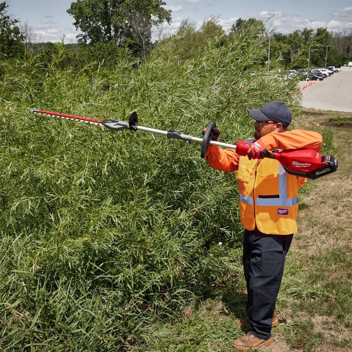 508mm Blade trims more material in a single pass, increasing reach and productivity Capable of cutting branches and limbs up to 19mm diameter Blade tip guard protects blades from contact with hard objects such as fencing Blade cover fully encloses the blade set for storage and transportation purposes Short length makes it perfectly suitable for topiary of high and wide hedges Straight shaft makes the tool more robust and the low weight more comfortable for the user Compatible with MILWAUKEE M18 FUEL outdoor power head QUIK-LOK attachment system