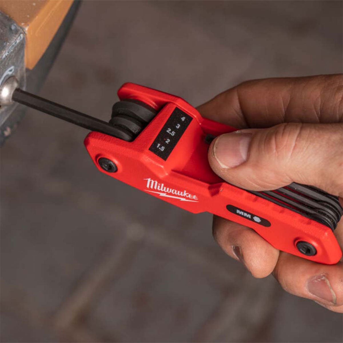 Milwaukee Metric Folding Hex Key Set 8 Piece is a set of hex keys that folds up for easy storage and portability. It includes eight different sized hex keys, ranging from 1.5mm to 8mm. The keys are made from chrome alloy steel for durability and have a black oxide finish for corrosion resistance. The set also includes a metal case to keep the keys organized.