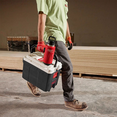 Milwaukee Packout 1065ml Chug Lid Red Bottle is a double-walled, vacuum-insulated liquids container designed to keep drinks hot or cold for extended periods. Made from 18/8 stainless steel for enhanced durability, the dishwater safe bottle is the easiest and possible most secure way to take your drink to site. Part of the PACKOUT Range, the bottle and be connected easily to other PACKOUT components thanks to the twist and lock mechanism.