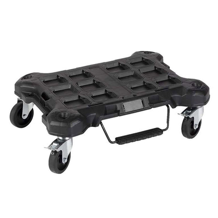 Part of the PACKOUT™ modular storage system. 113kg weight capacity. Durable casters to easily roll with heavy load on a jobsite. Includes 1 locking brake and 2 side locks to stop the trolley and easily connect the PACKOUT™ boxes and bags.