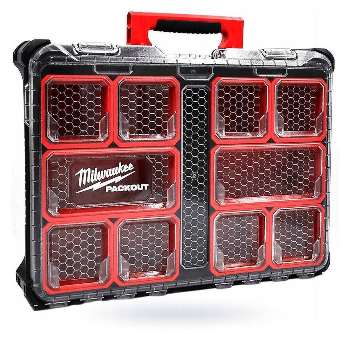 The Milwaukee 4932464082 organiser is part of the PACKOUT™ modular storage system. The interior features 10 removable & mountable bins that can be mounted onto common jobsite materials for easy access. IP65 rated weather seal to keep out rain and jobsite debris. No-travel bins seals to prevent the bins contents from migrating between bins during transport. Milwaukee Tool revolutionises tool transportation and organisation with the new PACKOUT™ tool storage cases. Designed as a modular system with the ability to swap and interlock a wide range of boxes and stackable tool cases. Heavy duty and created with professionals in mind, PACKOUT™ is the most versatile and durable modular storage system in the industry.