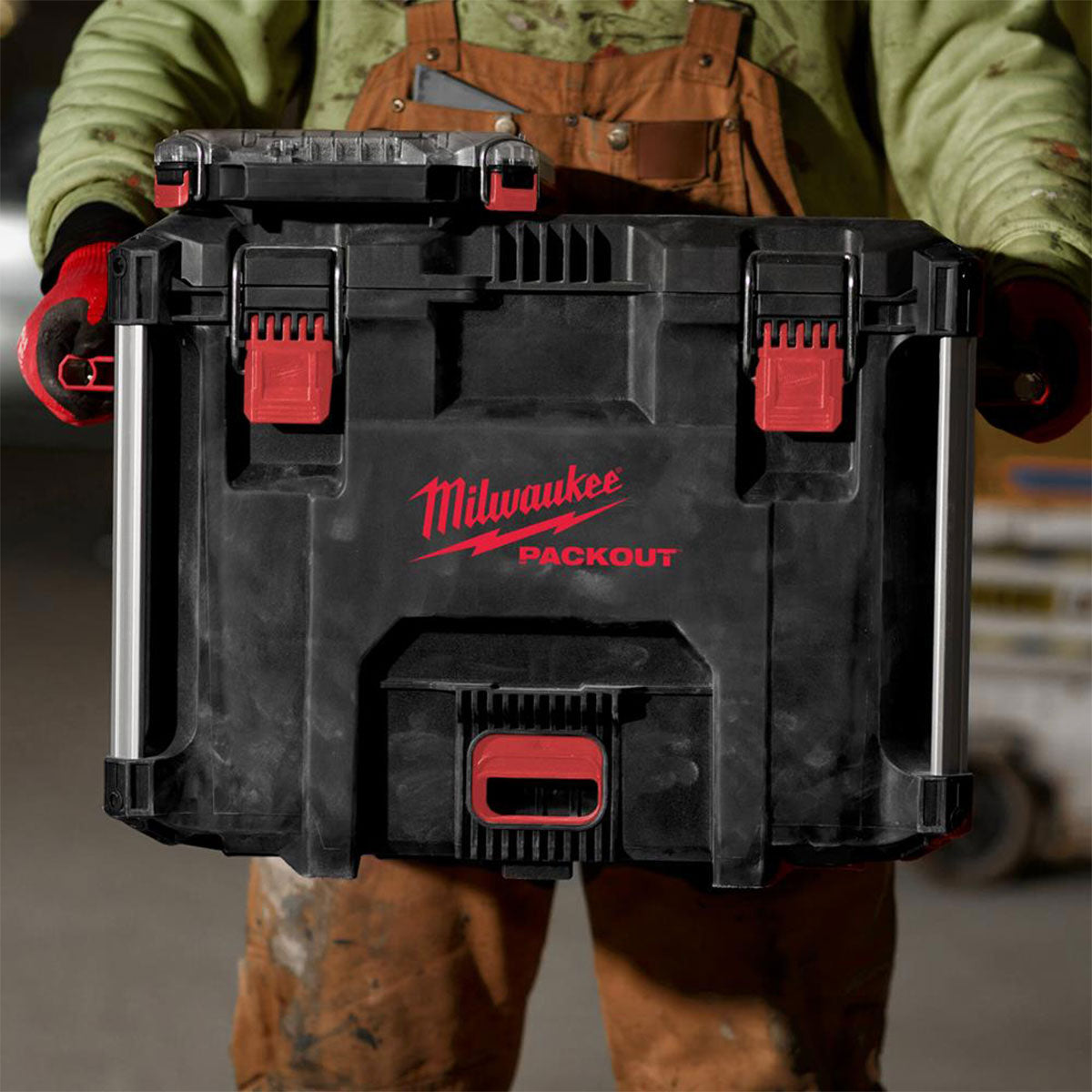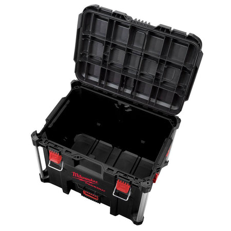 45 kg total weight capacity Part of the PACKOUT™ modular storage system Constructed with impact resistant polymers for jobsite durability IP65 rated weather seal to keep out rain and jobsite debris Metal reinforced corners Interior organiser tray for smaller accessories Mounting location for the ONE-KEY™ TICK Extra storage capacity for large power tools, such as band saws, angle grinders and hammers