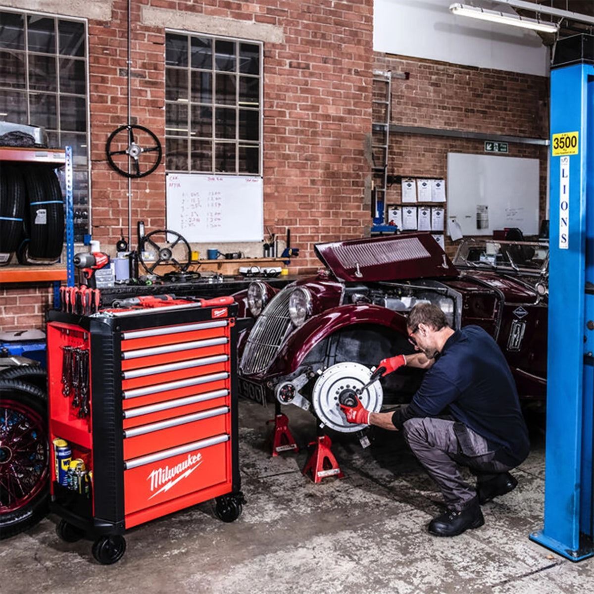 The Milwaukee SRC30-1 TOOLGUARD 30"/78 cm 7 Drawer Steel Storage Rolling Cabinet is a durable and versatile tool storage solution. It features 45 kg-rated soft-close drawers, with the bottom drawer rated at 90 kg, and anti-tilt protection for safety. The cabinet includes a recessed ABS worktop, magnetic power strip, and peg board for tool organization. It also offers additional side shelves and a power tool organizer in the bottom drawer. Equipped with 125 mm industrial casters, it supports a total weight capacity of 800 kg, making it ideal for heavy-duty garage use.