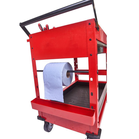 The Milwaukee SWC40-1 Toolguard 40" Steel Work Cart is a heavy-duty mobile storage solution designed for workshop efficiency. It features 45 kg rated soft-close drawers and a 90 kg rated sliding bottom shelf for storing heavy tools. Built-in compartments and two removable storage cups offer flexible organization, including space for long tools. The V-grooves assist with cutting and measuring tasks, while the foldable rear shelf supports up to 22 kg. A magnetic power strip allows for convenient on-cart battery charging, and 125 mm industrial casters ensure smooth mobility with a 315 kg total weight capacity.