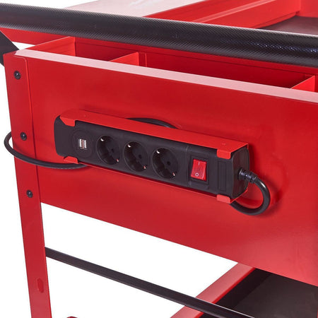 45 kg rated soft-close drawers. 90 kg rated sliding bottom shelf. Built-in storage compartments. 2 removable storage cups, which can be flipped upside down to create a flush surface or completely removed for vertical long tool storage. V-grooves to hold material when cutting or measuring. Foldable rear shelf with 22 kg weight capacity. 2 moveable shelves for storing bottles, sprays and other equipment. Rubber corner bumpers prevent damages when moved around the garage. Magnetic power strip allows to charge batteries directly on the cart. 125 mm industrial casters (2x fixed, 2x swiveling with brakes). 315 kg total weight capacity.