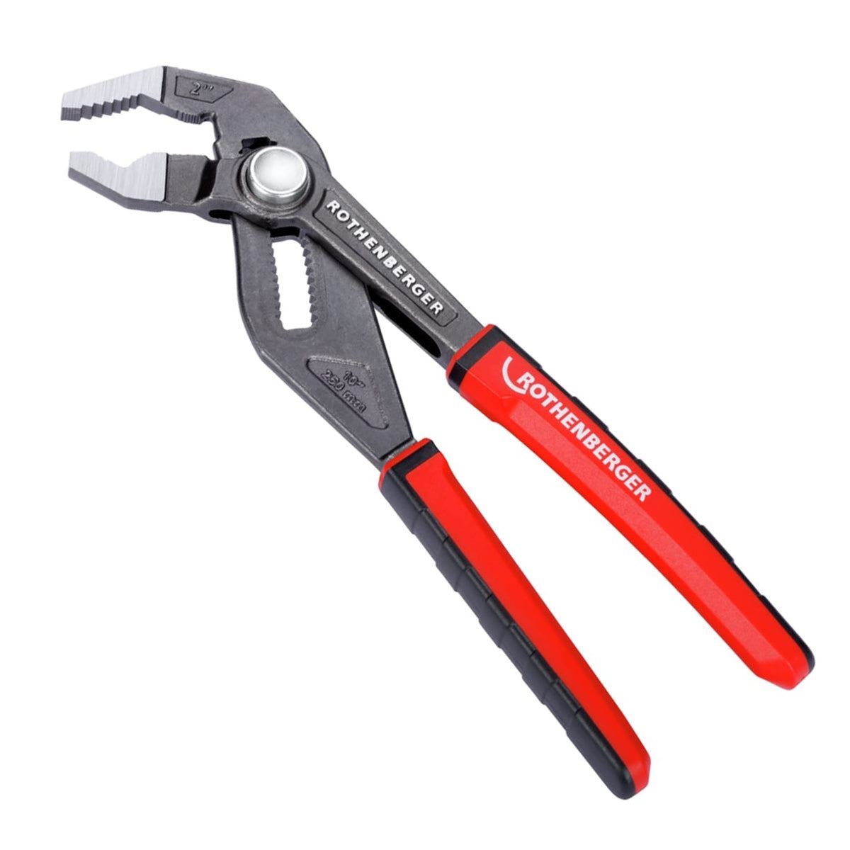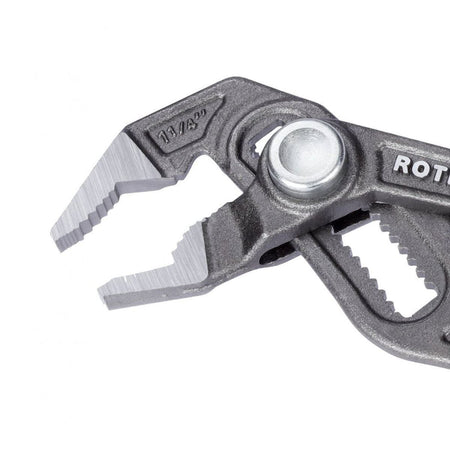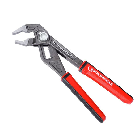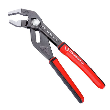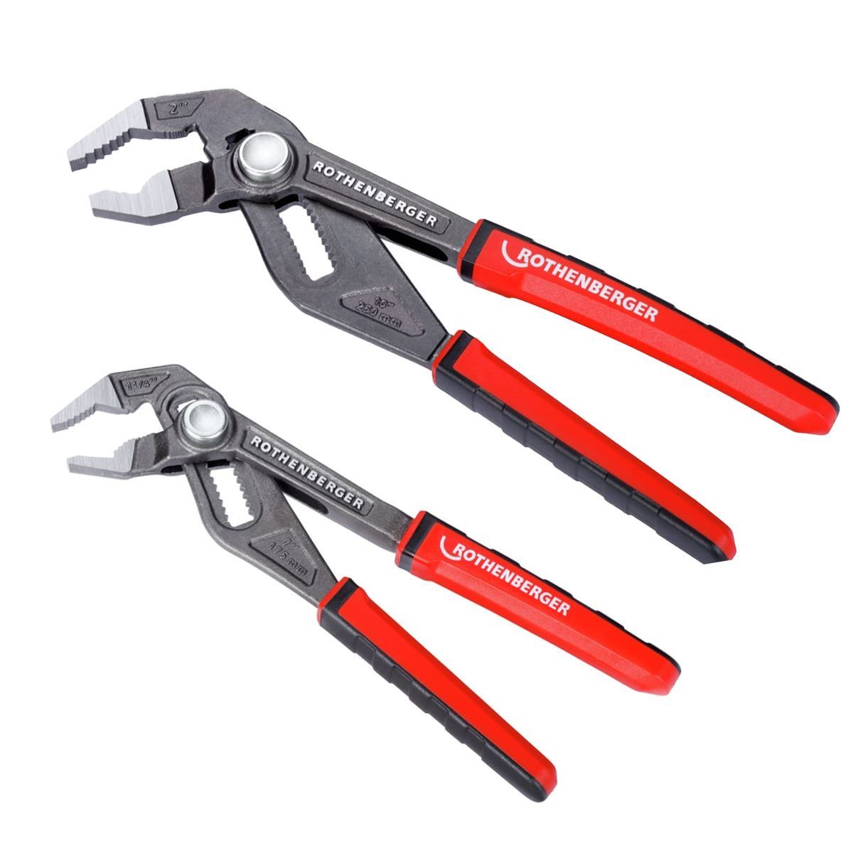 The Rothenberger Rogrip F Twin Pack includes 7" and 10" water pump pliers with advanced features for secure and efficient use. Both sizes offer self-clamping with a 3-point support system, ensuring a firm grip on smooth pipes. They feature wide handles for comfort, anti-slip plastic grips for safety, and a safety locking system to prevent accidental opening. With multiple adjustment positions (16 for the 7" and 18 for the 10"), these pliers provide versatility for various tasks while their Curve-Shape-Design reduces the risk of pinching fingers.