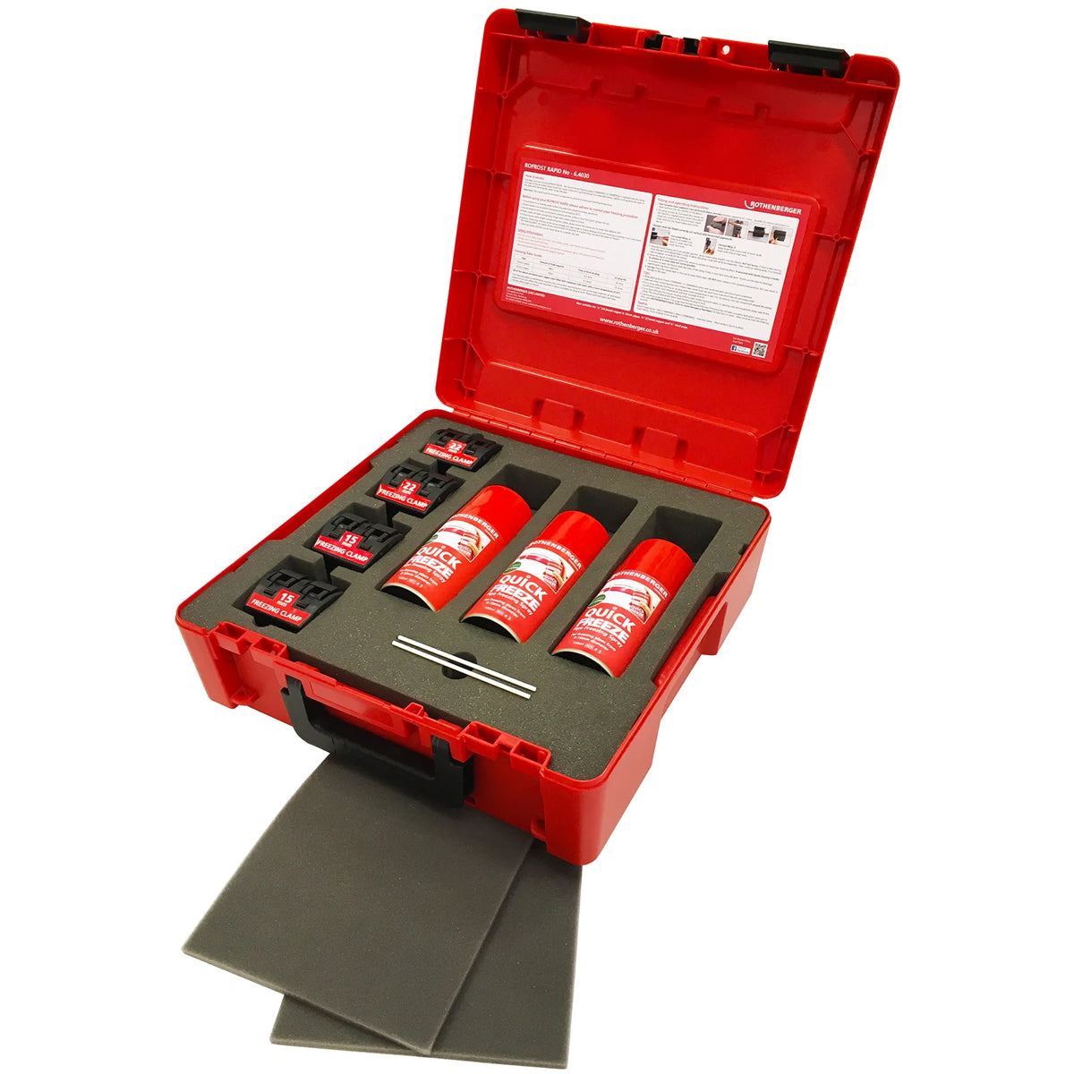 The Rothenberger 1000003035 Rofrost Rapid Pipe Freezing Kit includes four freeze clamps, two sheets of contact foam, and three 150-ml quick-freeze sprays. The design of the clamps retains the quick freeze sprayed into the foam-lined clamps. As the spray evaporates, the pipe cools, causing the water in the pipe to freeze, thereby creating a natural plug of ice that stops the flow. The 15mm and 22mm clamps included in this kit are designed to be 50% quicker and use 50% less freezing spray than alternative freezing systems. The Rothenberger 1000003035 Rofrost Rapid Pipe Freezing Kit is simple and safe to use, even with clipped pipes.