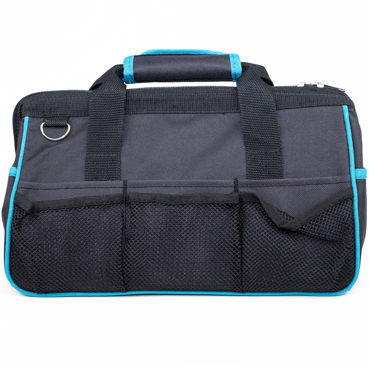 Design: Zip-out panels for immediate access to the tools you need. Pockets and holders (including a padded mobile phone holder) for easy access to tools and equipment. Lining: A bright Blue outer lining for easy visibility of the stored items. Easy Portability: Padded handle and removable shoulder strap for maximum comfort. Suitability: Suitable for storing electronic equipment as well as holding tools. Fabric: 600D canvas PVC coating double layer. Waterproof Level: 600D front normal fabricand Fabric back inside with PVC, water cannot penetrater.