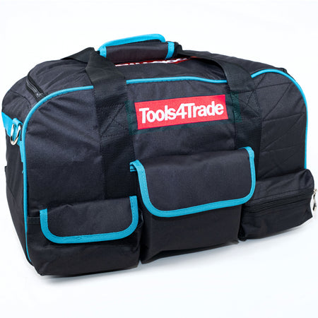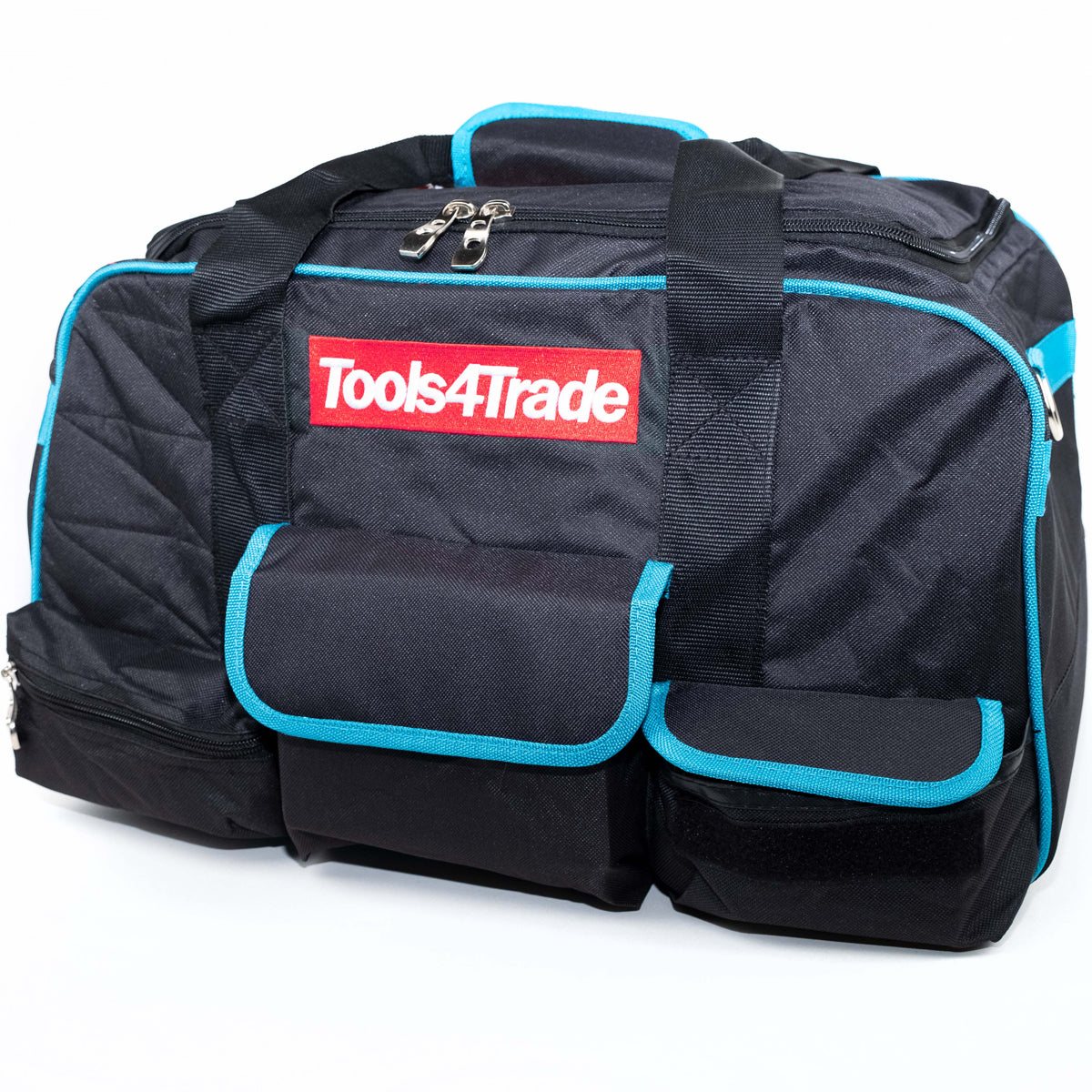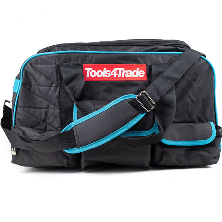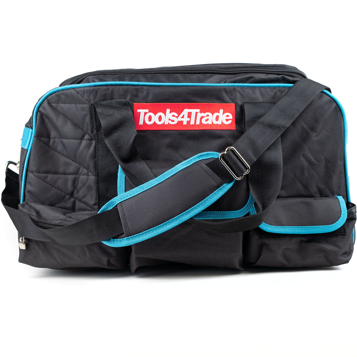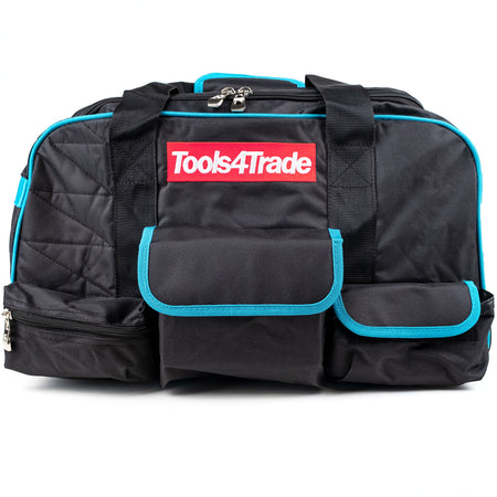 Barcode: 5056533409327 Brand: Tools4trade Colour: Black & Blue Outer Lining: Blue Size: Medium (22") Material: Polyester Fabric Type: Embroidered ( 600D) Fabric: (600x300) No. of item: 1 Pockets inside: 3 Pockets small: 2 Piping: +edge Waterproof: Yes Zipped: Yes Wheels: No Dimensions: 510(L) x 280(W) x 300(H)mm